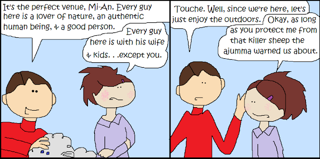 Today's drama starts when Mi-An meets D.B. for an outing. He told her to "dress casual," and he meant it.
